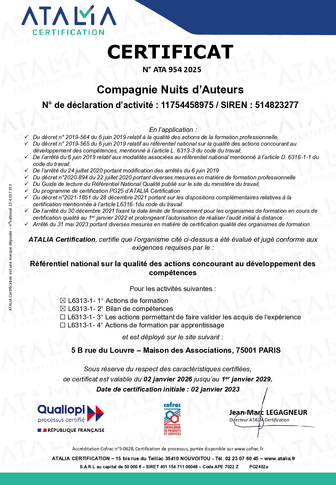 Par ailleurs, nous signons ensemble les feuilles d’émargement lors de nos rendez-vous à Paris. Par conséquent, la conformité de votre dossier est garantie auprès de la Caisse des Dépôts ainsi que de l’organisme certificateur Qualiopi.